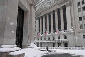 A pedestrian walks outside the New York Stock Exchange during a snow