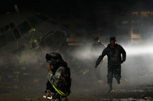 Military police on the scene where a plane crashed in El Alto, Bolivia,