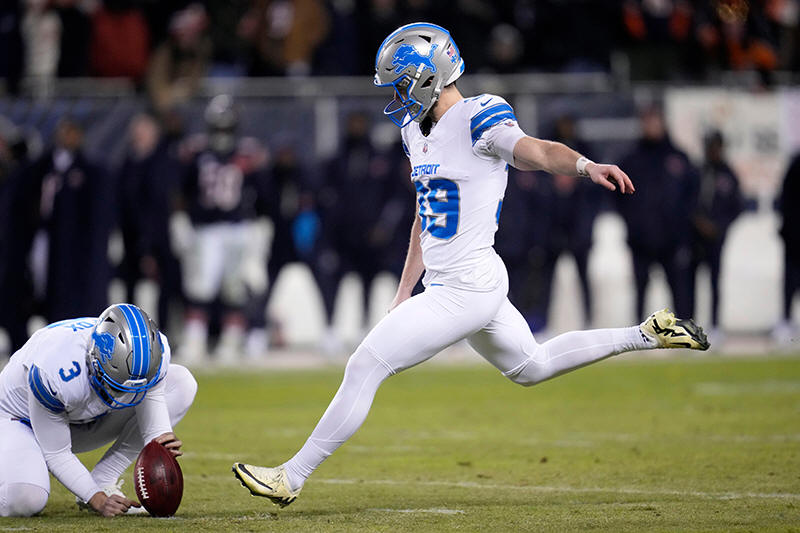 Detroit Lions place kicker Jake Bates (39) kicks a field goal on the