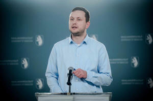 Greenland's Prime Minister Jens Frederik Nielsen holds a press
