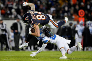 Chicago Bears tight end Colston Loveland (84) is tackled by Detroit