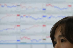 A dealer watches computer monitors at a dealing room of Hana Bank in