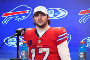Buffalo Bills' Josh Allen pauses during a news conference after an