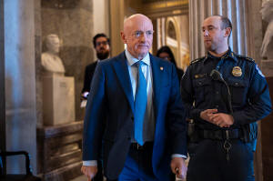 Sen. Mark Kelly, D-Ariz., exits the Senate chamber after speaking