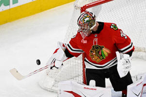 Chicago Blackhawks goaltender Spencer Knight defends against the