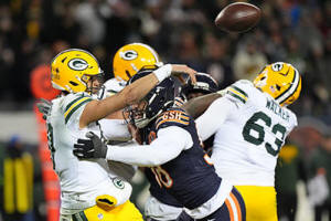 Green Bay Packers' Jordan Love throws as he is hit by Chicago Bears'