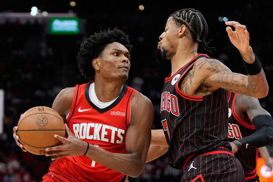 Rockets guard Amen Thompson (1) during the first half of an NBA