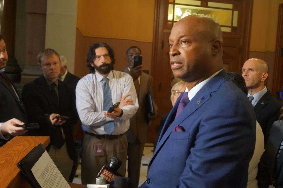 House Speaker Emanuel “Chris” Welch, D-Hillside, speaks to reporters outside his office on Oct. 15, 2025. (Capitol News Illinois photo by Peter Hancock)