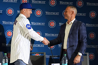 president of baseball operations Jed Hoyer at a news conference in