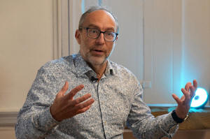 Jimmy Wales, founder of Wikipedia, gestures during an interview with