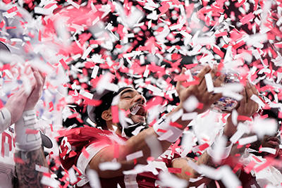 Elijah Sarratt (13) holds up the trophy after the Peach Bowl NCAA