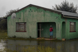 A woman stands outside a flooded house in Nkomazi, Mpumalanga