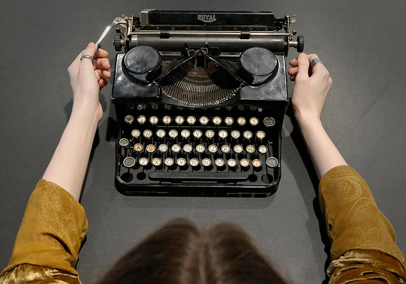 A Bonhams employee displays a Royal Portable Typewriter Owned By