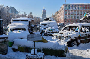 Snow covered, damaged Russian military vehicles are on display in