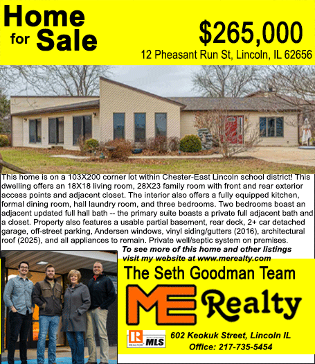 All real estate advertised in the Lincoln Daily News is subject to the Fair Housing Act for 1968 which makes it illegal to advertised "any preference, limitation, or discrimination based on race, color, religion, sex or national origin, or intention to make special preference, limitations, or discrimination."