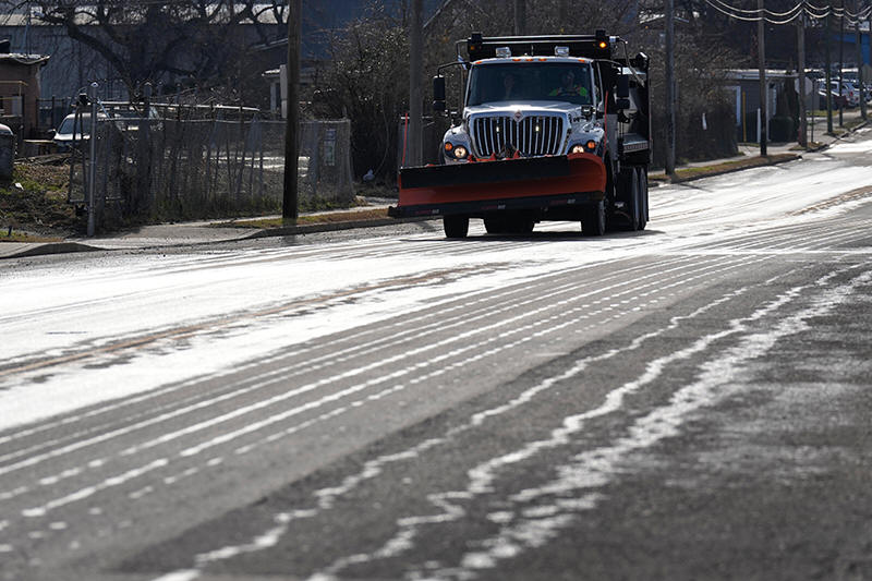 A Nashville Department of Transportation truck applies salt brine to