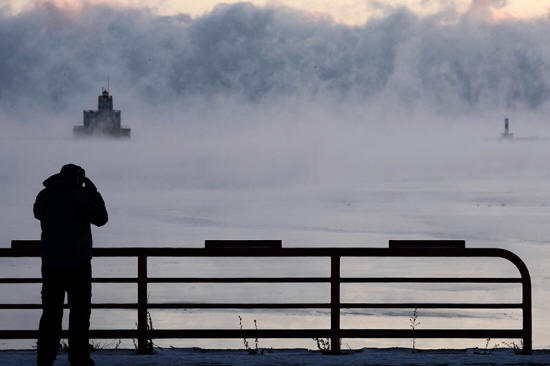Doug Kunde watches as steam is seen over Lake Michigan as frigid