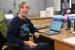 Art teacher Joyce Hatzidakis poses for a portrait in her classroom
