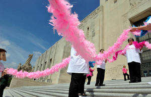 People hold a large pink feather ribbon for emphasis while gathering