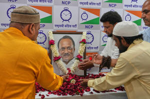 Supporters of Maharashtra Deputy Chief Minister Ajit Pawar pay homage