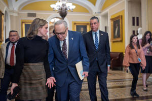 Minority Leader Chuck Schumer, D-N.Y., joined at right by Sen. Alex