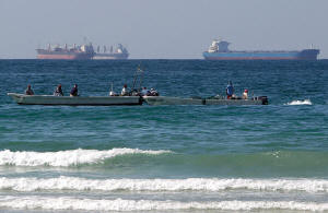 Fishermen work in front of oil tankers south of the Strait of Hormuz