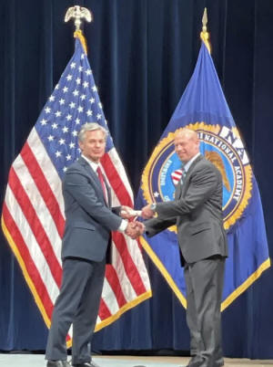 shaking hands with then FBI Director Christopher Wray, heralding
