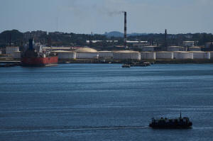 A ferry crosses Havana Bay past the Nico Lopez oil refinery where a