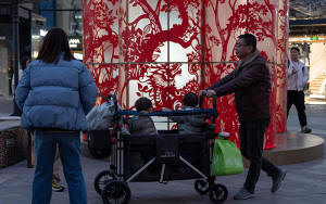 A man pushes children in a cart at a mall in Beijing, Sunday, March