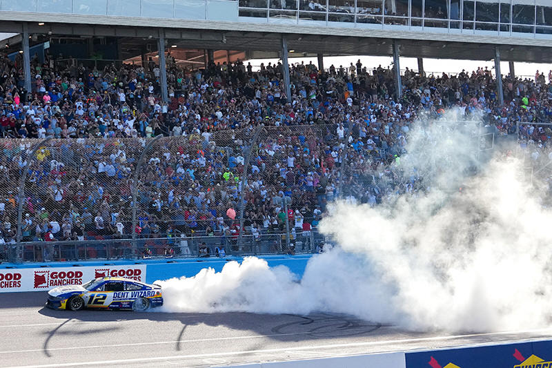 Ryan Blaney (12) does a burnout after winning a NASCAR Cup Series