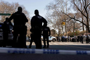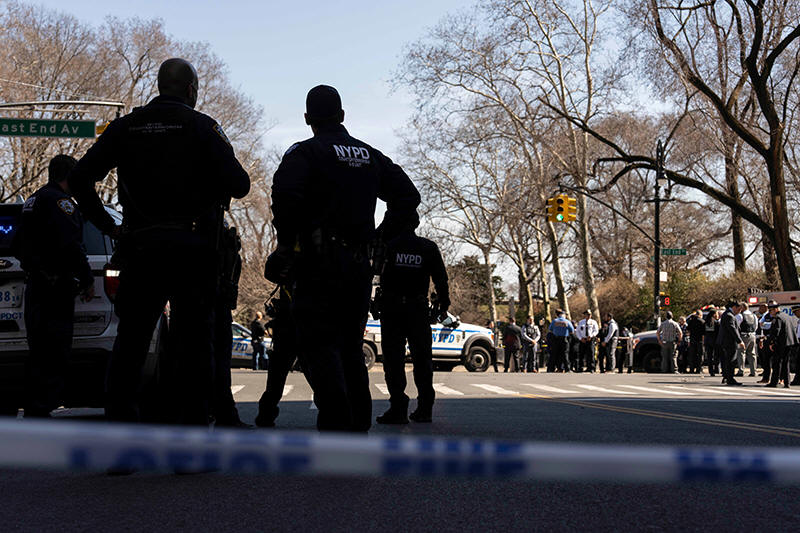 NYPD officers stand outside Carl Schurz Park as they investigate