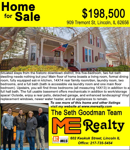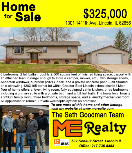 All real estate advertised in the Lincoln Daily News is subject to the Fair Housing Act for 1968 which makes it illegal to advertised "any preference, limitation, or discrimination based on race, color, religion, sex or national origin, or intention to make special preference, limitations, or discrimination."