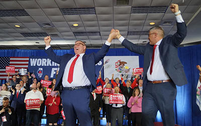 Darren Bailey celebrates with running mate Aaron Del Mar after securing the Republican nomination for governor in the 2026 general election. He will once again face Gov. JB Pritzker after losing by over 12 points in 2022. (Capitol News Illinois photo by Peter Hancock)