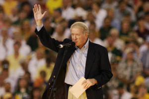Green Bay Packers president Bob Harlan waves to the crowd at the