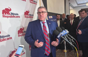 Republican nominee for governor Darren Bailey speaks to reporters