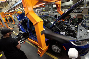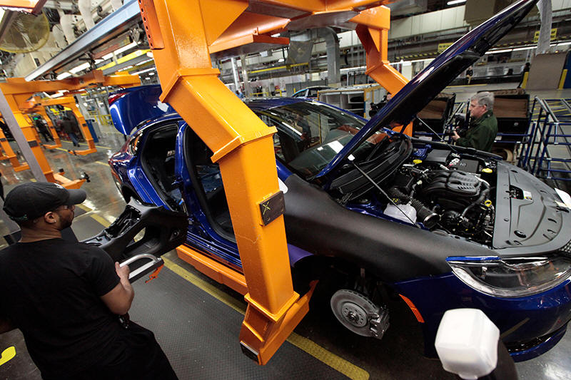 In this March 14, 2014, file photo, an assembly line worker builds a 2015 Chrysler 200 automobile at the Sterling Heights Assembly Plant in Sterling Heights, Mich. Fiat (AP Photo/Paul Sancya, File)