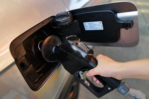 A person fills up her vehicle's gas tank at a gas station in Buffalo