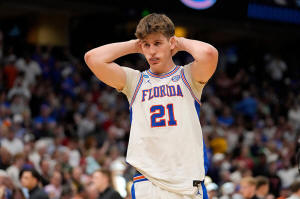 Florida forward Alex Condon (21) reacts after the team lost to Iowa