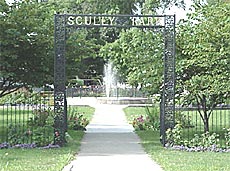 beds turned to weeds, and the plaque for Mrs. Scully on the fountain