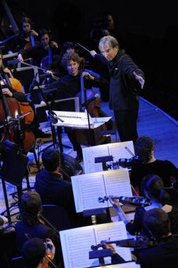 "It was a very talented group of individuals," Diaz said in an interview. "Every rehearsal, it's just gotten better and better, and they've gotten this sense of group rhythm, which is a fundamental part of it all. ... To do that in 48 hours is amazing." The Internet generation of performers attracted a youthful crowd that had no reason to feel shy. The staid decorum was suspended for the three-hour concert, which featured 15 short pieces. Thomas sat on the podium at one point, watching pianist Yuja Wang fly through the "Flight of the Bumble Bee." Images of musical notes, geometric patterns and of the players were projected on the walls and ceiling, and the audience was encouraged to bring video cameras. One of the many high points was Tan's 4 1/2 minute "symphony," a high-octane work conducted by the composer who packed it with hammer whacks on hanging tire hubs, a cinematic melody and references to Beethoven's "Eroica." Other outstanding performances were given by soloists Joshua Roman on cello, the violinist and guest star Gil Shaham, soprano Measha Brueggergosman (singing the gibberish lyrics in Cage's bizarre "Aria with Renga") and Mason Bates playing the Apple computer synthesizer in his thumping electronic "Warehouse Medicine from B-Sides." The show was nearly stolen by three youngsters mentored by the pianist Lang Lang