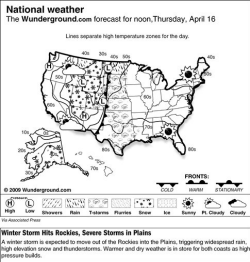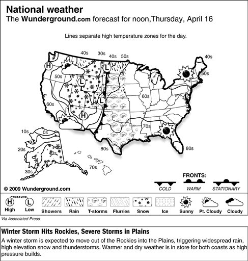 [April 16, 2009]  (AP)  Active weather was expected in the Plains on Thursday. Moisture from the Gulf of Mexico was to bring snow and low-elevation rain in the Rockies. Scattered showers and thunderstorms with strong winds were expected over the central and southern Plains, while scattered showers were expected in the northern Plains, continuing flooding problems there.