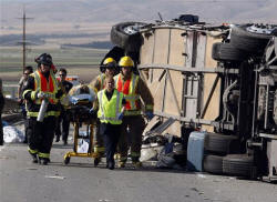 The highway was temporarily shut down in both directions; northbound lanes reopened a couple hours later, and it was unclear when southbound lanes would reopen. Adrienne Laurent, a spokeswoman for the Salinas Valley Memorial Hospital, said the facility had received three patients from the crash. She said one of those patients, a 52-year-old man, was declared dead there. Patients also were being treated at eight other hospitals. The Red Cross was helping coordinate housing and other services Tuesday night for three families who survived the crash and were released from hospitals, said Paula Herrera, executive director of the Monterey-San Benito chapter. CHP spokeswoman Fran Clader in Sacramento could not comment on Orion Pacific's safety record pending the accident investigation. The company has been operating since 1985, according to its Web site.