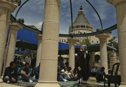 -- though not in Israel. Attackers fired guns and threw firebombs at Palestinian churches. Benedict later said the text did not reflect his views, but many Muslims believe he did not apologize properly. In Nazareth, the pontiff is to visit the Church of the Annunciation, host an interfaith discussion and meet with Israeli Prime Minister Benjamin Netanyahu. He'll also celebrate Mass on nearby Mount Precipice, where many Christians believe a mob pursued Jesus and tried to throw him from a cliff. The pope will strive to improve interfaith relations throughout his tour, said Wadi Abunassar, a spokesman for the pontiff's visit. Nazareth's local government has set aside $5 million to spruce up the crowded, shabby city overlooking the Galilee hills, hoping the papal visit will boost tourism, Mayor Ramiz Jaraisy said. Few in Nazareth's bazaar show any excitement, however. Many remain bitter over Israel's offensive in Gaza against Hamas militants, which killed more than 1,000 Palestinians in December and January. "People here are tired and exhausted from this situation," said Amin Ali, 72, an antique seller who described himself as a secular Muslim. "And nobody likes this pope, anyway." Benedict should use his visit to censure Israel over Gaza and the lack of progress in reaching peace with the Palestinians, said Ateek, the Anglican reverend. "If the pope is brave enough to do that, people will respect him more," Ateek said.