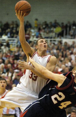But Wroblewski scored 10 points in the period to help lead the Big Red back and Dale's runner in the lane completed an eight-point spurt that tied the game at 20-all with 8:50 to go. The Big Red closed the half with a 12-6 run to gain a 34-28 lead at the break over the undermanned Quakers, who were without seven injured players.