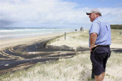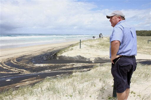 Sunshine Coast tourism operators have already been hard hit by weeks of bad weather, culminating in battering winds and driving rain associated with Cyclone Hamish which roared offshore last week. On Friday, tourists and locals gathered in pockets along the worst-hit beaches to survey the scene. Surfers left their boards back at their hotels or home. One mother told her disappointed daughter that she would have to leave her plastic pail and shovel in the car because the beach was closed. In the resort town of Coolum, about 60 miles (100 kilometers) north of Brisbane, tourists who usually snapped pictures of each other on a popular seaside boardwalk instead had their cameras trained on the ugly black surf. About 30 miles (45 kilometers) south, government workers raked up oil-coated sand while wildlife officials tried to catch and clean birds soaked in the sticky substance. "This is our beach. I've been coming here for years, and it's sad to see this happen here," said resident Vicki Ayliffe, as she picked up soft drink containers and milk cartons coated with oil. The state Environment Protection Agency was concerned about the spill's impact on wildlife but said Friday only 13 oil-affected animals had been spotted. Spokesman Clive Cook said agency workers had caught and cleaned three of those