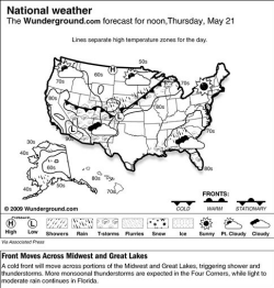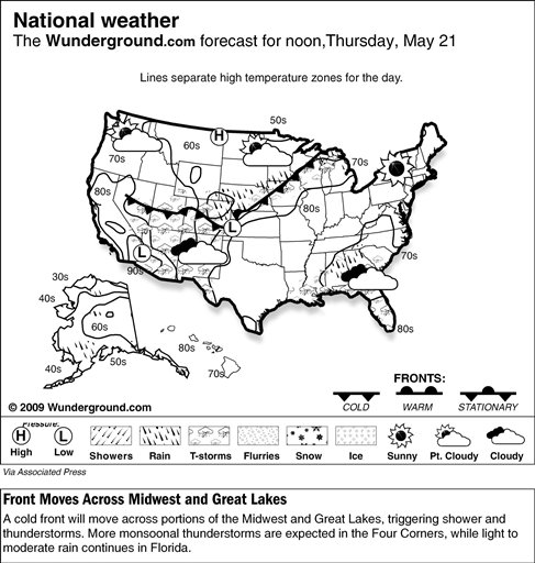[May 21, 2009]  (AP)  A cold front racing across the Midwest, persistent rain across Florida and thunderstorms in the Southwest were expected to be the most significant weather developments on Thursday.