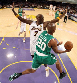 Bryant's vaunted defense didn't help much after switching onto Allen, and Kobe didn't even get his second field goal of the game until Allen already had 22 points. Bryant spent most of the first half's final minutes on the bench after picking up his third foul on a charging call drawn by Allen.