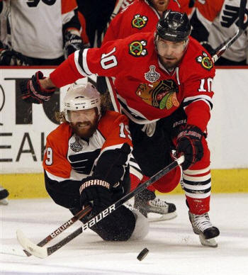 Blackhawks center Patrick Sharp (10) heads down the ice in the first