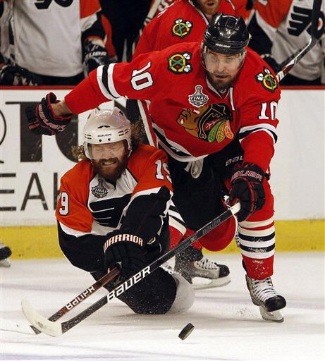 left wing Scott Hartnell (19) dives for the puck as Chicago