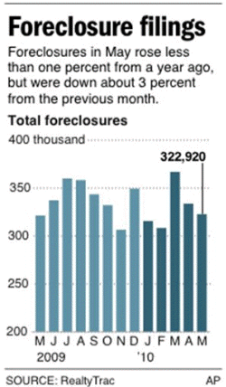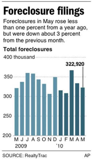 About 25 percent of the 1.2 million homeowners who started the program over the past year had received permanent loan modifications as of April. About 23 percent of those enrolled dropped out during a trial phase that lasts at least three months. Many more are in limbo. Among states, Nevada posted the highest foreclosure rate in May. One in every 79 households there received a foreclosure notice. However, foreclosures there are down 16 percent from a year earlier. Arizona, Florida, California and Michigan were next among states with the highest foreclosure rates. Rounding out the top 10 were Georgia, Idaho, Illinois, Utah and Maryland. Las Vegas continued to be the city with the nation's highest foreclosure rate, but activity there was down 18 percent from a year earlier. And nine out of the top 10 cities with the highest foreclosure rates posted annual declines. The exception was the Vallejo-Fairfield area in California, where foreclosures were up 1 percent from a year ago. Foreclosed homes are typically sold at steep discounts, lowering the value of surrounding properties. That's a concern for local communities, and a drag on the economic recovery. In recent months, home prices have started to sink again after stabilizing last summer. Economists at Goldman Sachs predicted in a report last week that prices will fall about 3 percent nationally over the next year, with the largest declines in cities where mortgage defaults are rising. "The housing market remains plagued by enormous excess supply," wrote Goldman economist Sven Jari Stehn.